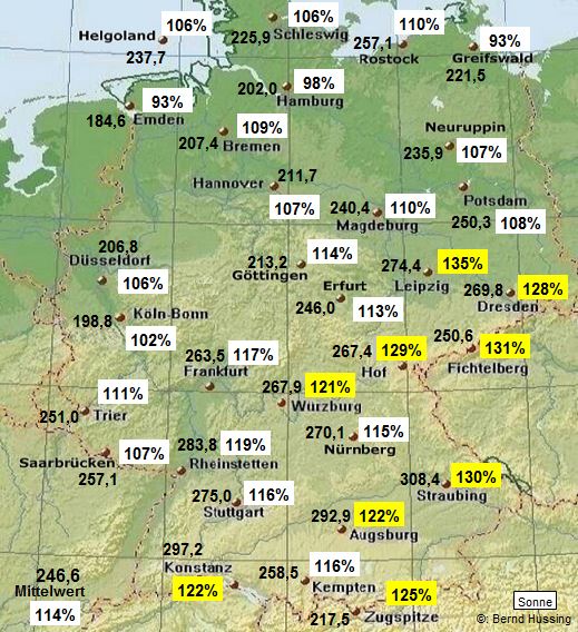 Sonnenscheinsumme, dahinter die Prozente im Vergleich zum langjährigen Mittel (1961-1990)