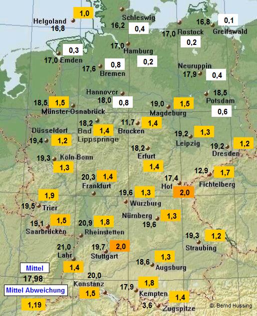 Temperaturmittel, dahinter die Abweichung zum langjährigen Mittel (1961-1990)