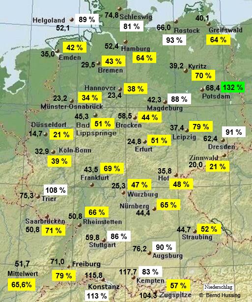 Niederschlagssumme, dahinter die Prozente im Vergleich zum langjährigen Mittel (1961-1990)