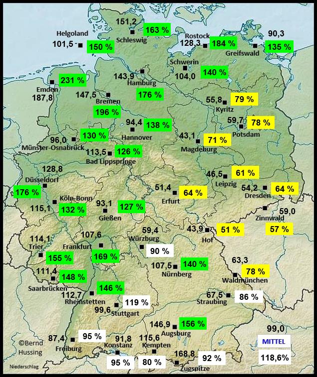 Niederschlagssumme, dahinter die Prozente im Vergleich zum langjährigen Mittel (1991-2020)