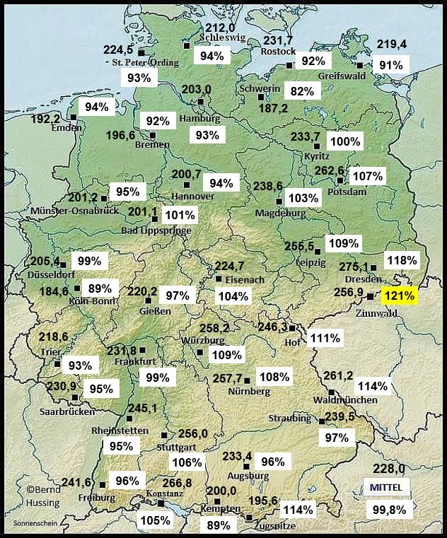 Sonnenscheinsumme, dahinter die Prozente im Vergleich zum langjährigen Mittel (1991-2020)