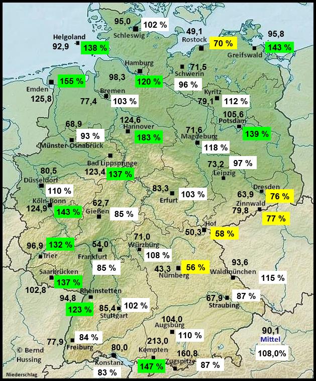Niederschlagssumme, dahinter die Prozente im Vergleich zum langjährigen Mittel (1991-2020)