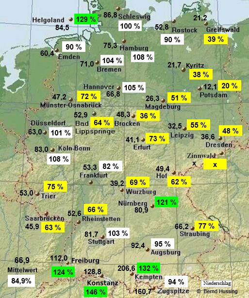 Niederschlagssumme, dahinter die Prozente im Vergleich zum langjährigen Mittel (1961-1990)