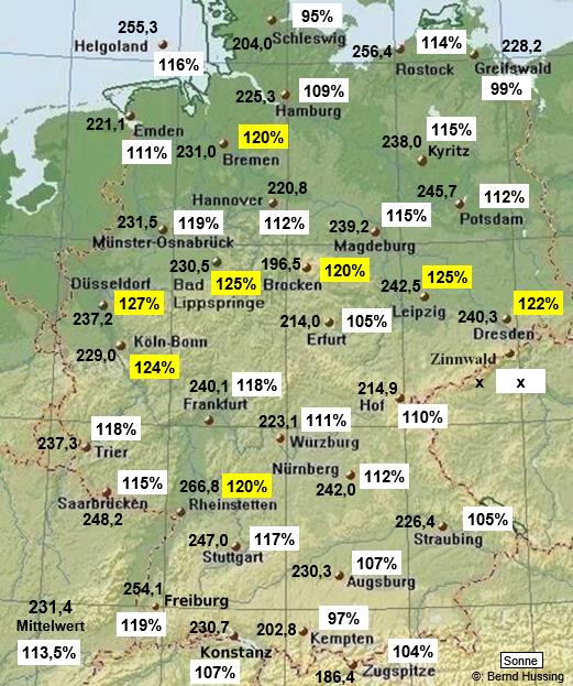 Sonnenscheinsumme, dahinter die Prozente im Vergleich zum langjährigen Mittel (1961-1990)