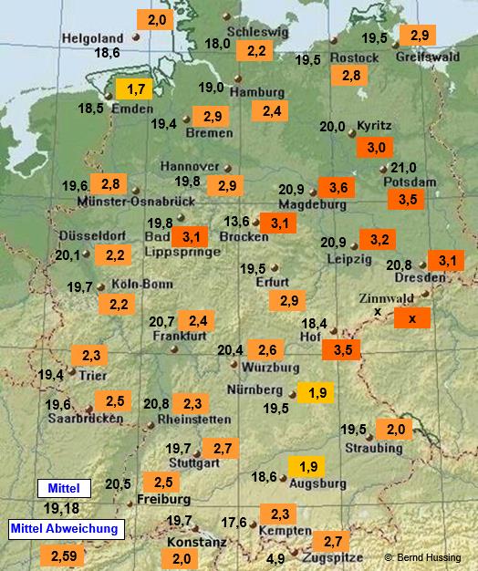 Temperaturmittel, dahinter die Abweichung zum langjährigen Mittel (1961-1990)