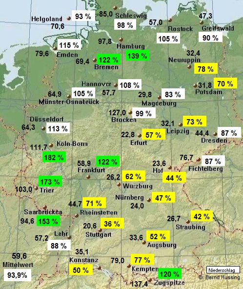 Niederschlagssumme, dahinter die Prozente im Vergleich zum langjährigen Mittel (1961-1990)