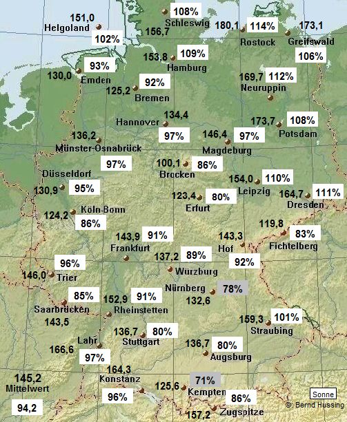 Sonnenscheinsumme, dahinter die Prozente im Vergleich zum langjährigen Mittel (1961-1990)