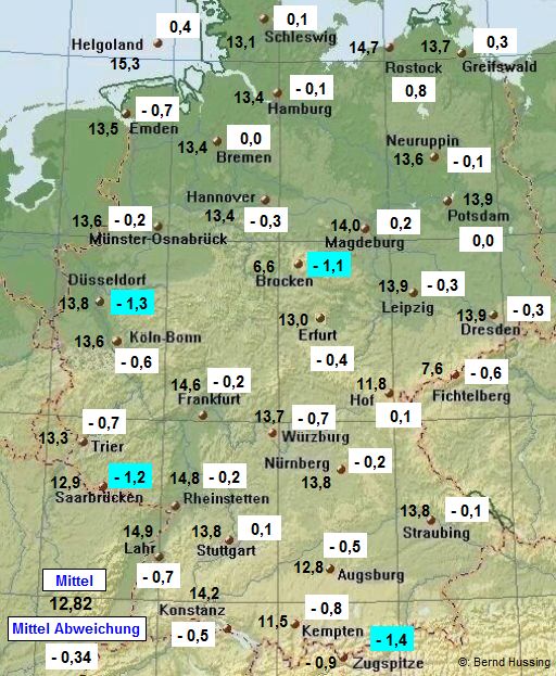 Temperaturmittel, dahinter die Abweichung zum langjährigen Mittel (1961-1990)