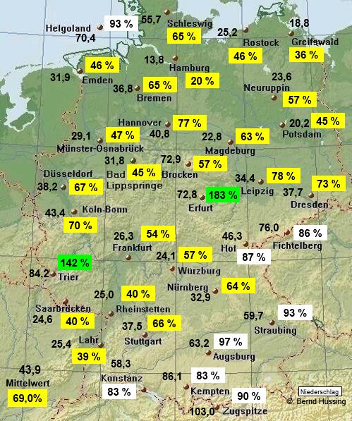 Niederschlagssumme, dahinter die Prozente im Vergleich zum langjährigen Mittel (1961-1990)
