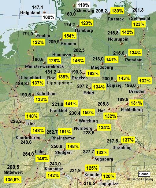 Sonnenscheinsumme, dahinter die Prozente im Vergleich zum langjährigen Mittel (1961-1990)