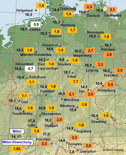 Temperaturmittel, dahinter die Abweichung zum langjährigen Mittel (1961-1990)