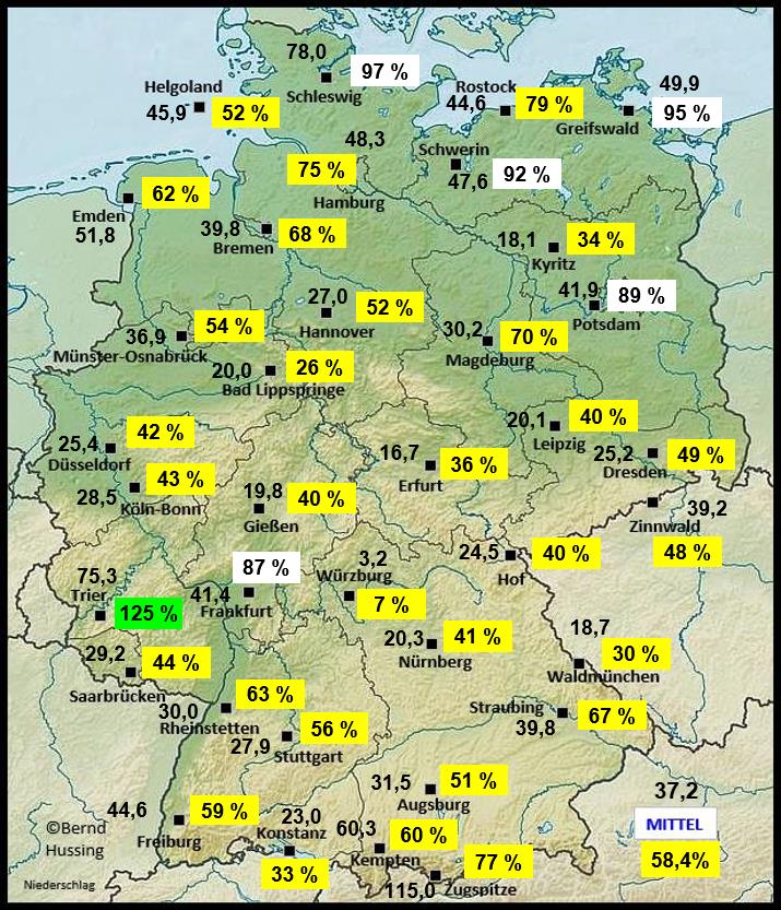 Niederschlagssumme, dahinter die Prozente im Vergleich zum langjährigen Mittel (NEU: 1991-2020)