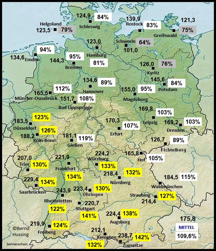 Sonnenscheinsumme, dahinter die Prozente im Vergleich zum langjährigen Mittel (NEU: 1991-2020)