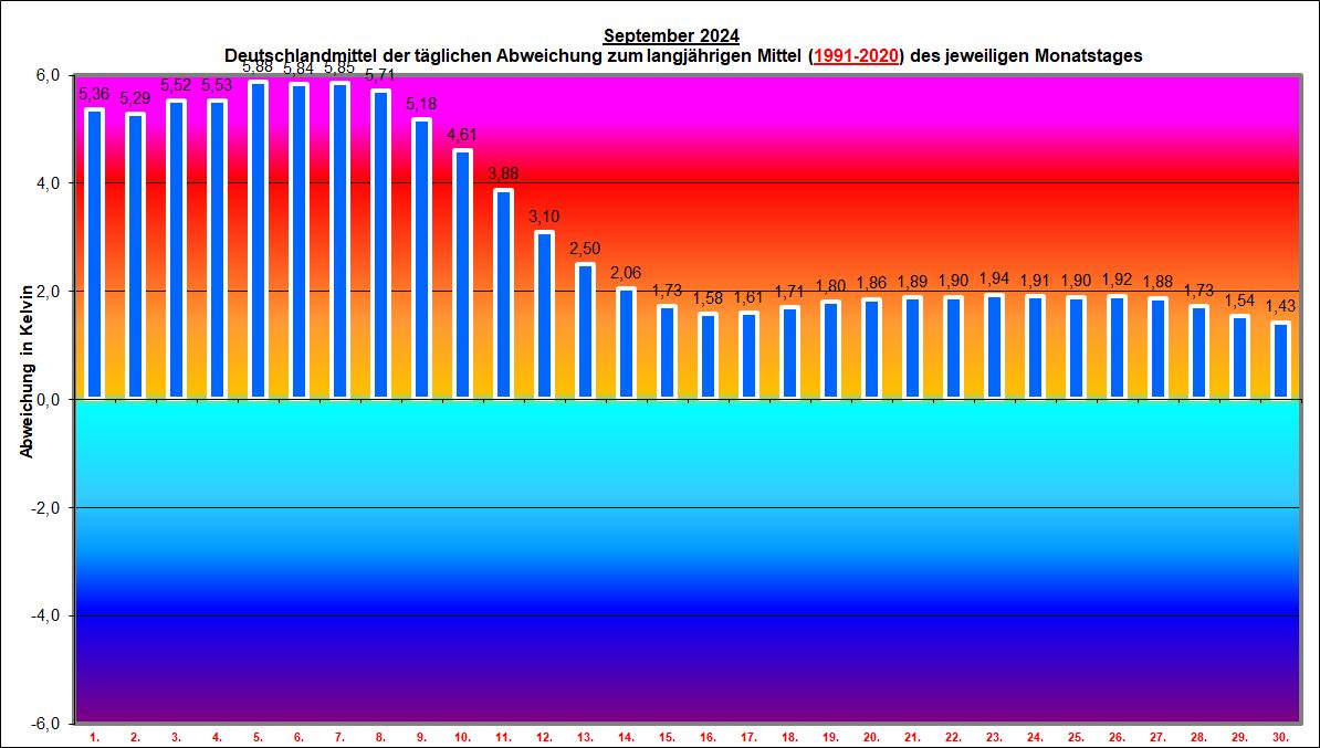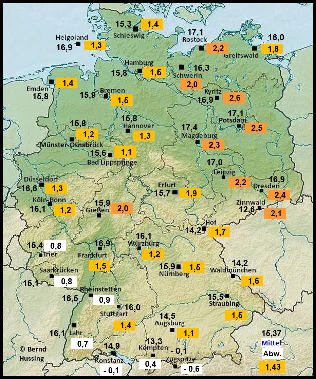 Temperaturmittel, dahinter die Abweichung zum langjährigen Mittel (1991-2020)