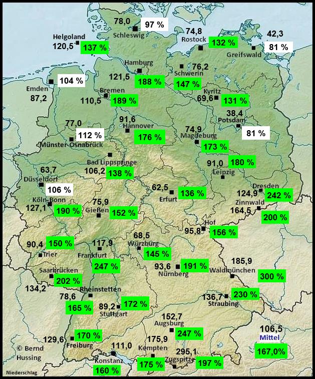 Niederschlagssumme, dahinter die Prozente im Vergleich zum langjährigen Mittel (1991-2020)