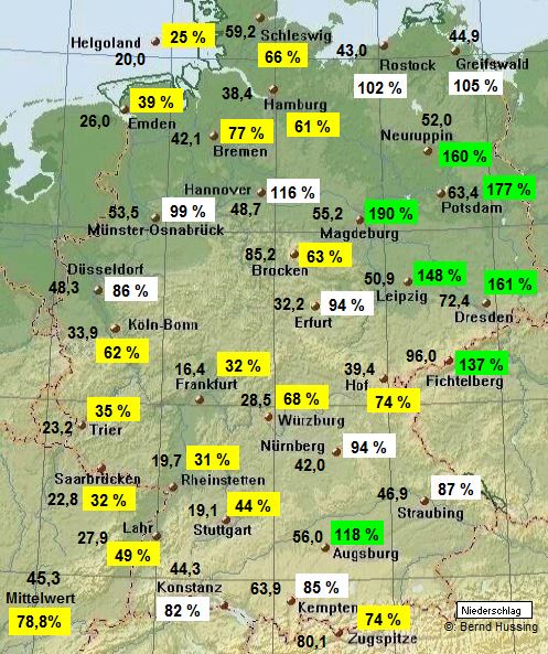Niederschlagssumme, dahinter die Prozente im Vergleich zum langjährigen Mittel (1961-1990)