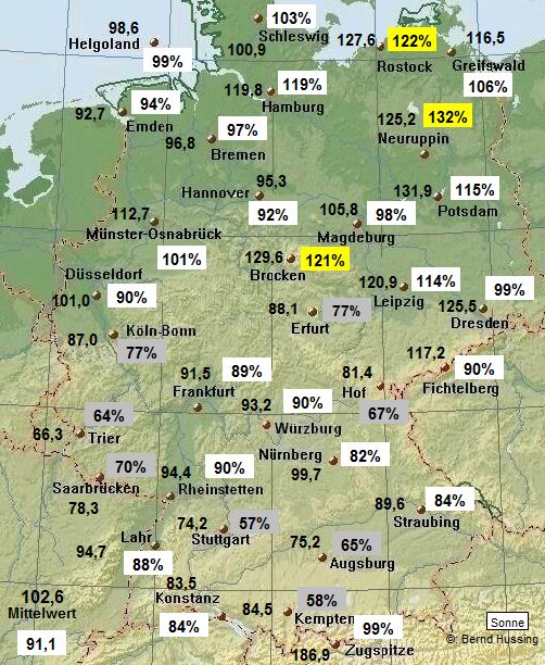 Sonnenscheinsumme, dahinter die Prozente im Vergleich zum langjährigen Mittel (1961-1990)