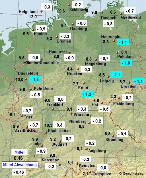 Temperaturmittel, dahinter die Abweichung zum langjährigen Mittel (1961-1990)