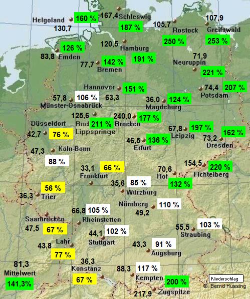 Niederschlagssumme, dahinter die Prozente im Vergleich zum langjährigen Mittel (1961-1990)