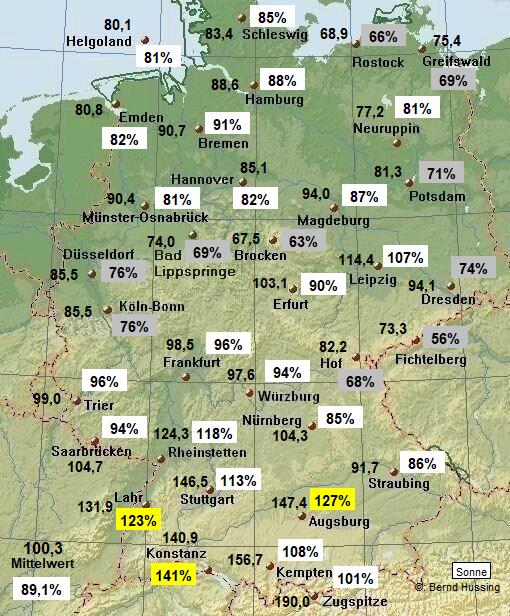 Sonnenscheinsumme, dahinter die Prozente im Vergleich zum langjährigen Mittel (1961-1990)
