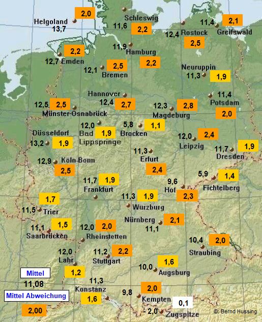 Temperaturmittel, dahinter die Abweichung zum langjährigen Mittel (1961-1990)