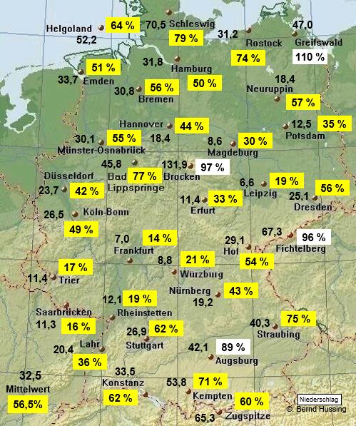Niederschlagssumme, dahinter die Prozente im Vergleich zum langjährigen Mittel (1961-1990)