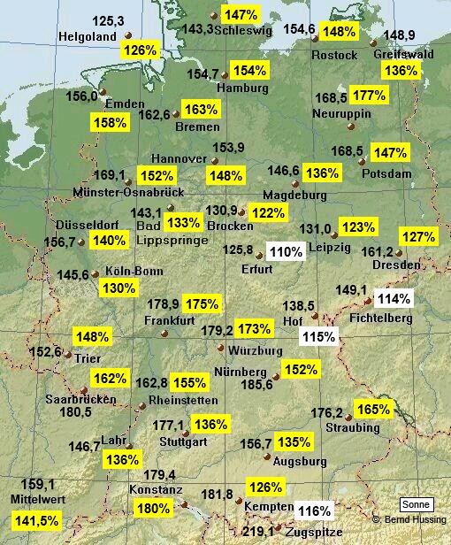 Sonnenscheinsumme, dahinter die Prozente im Vergleich zum langjährigen Mittel (1961-1990)