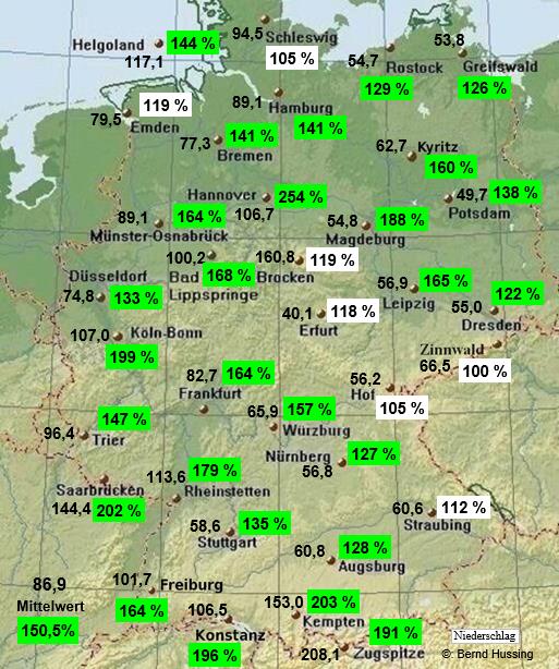 Niederschlagssumme, dahinter die Prozente im Vergleich zum langjährigen Mittel (1961-1990)