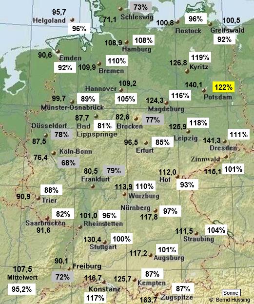 Sonnenscheinsumme, dahinter die Prozente im Vergleich zum langjährigen Mittel (1961-1990)
