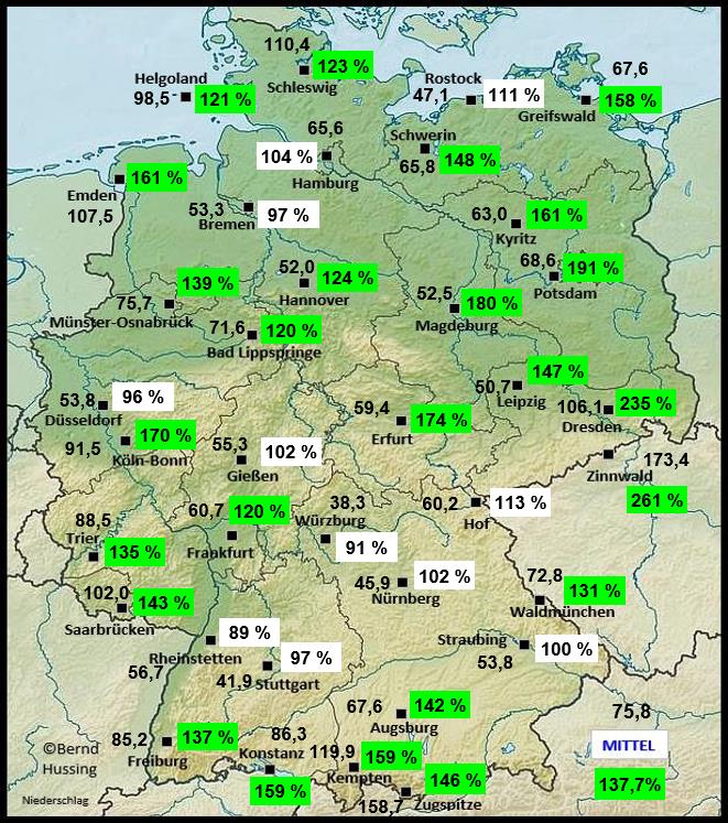 Niederschlagssumme, dahinter die Prozente im Vergleich zum langjährigen Mittel (1961-1990)