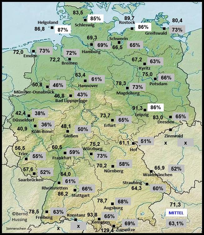 Sonnenscheinsumme, dahinter die Prozente im Vergleich zum langjährigen Mittel (1961-1990)