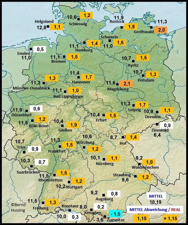 Temperaturmittel, dahinter die Abweichung zum langjährigen Mittel (1961-1990)