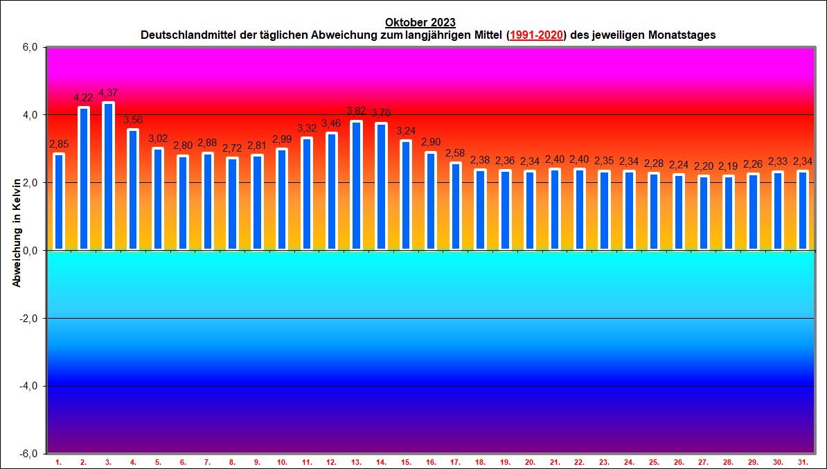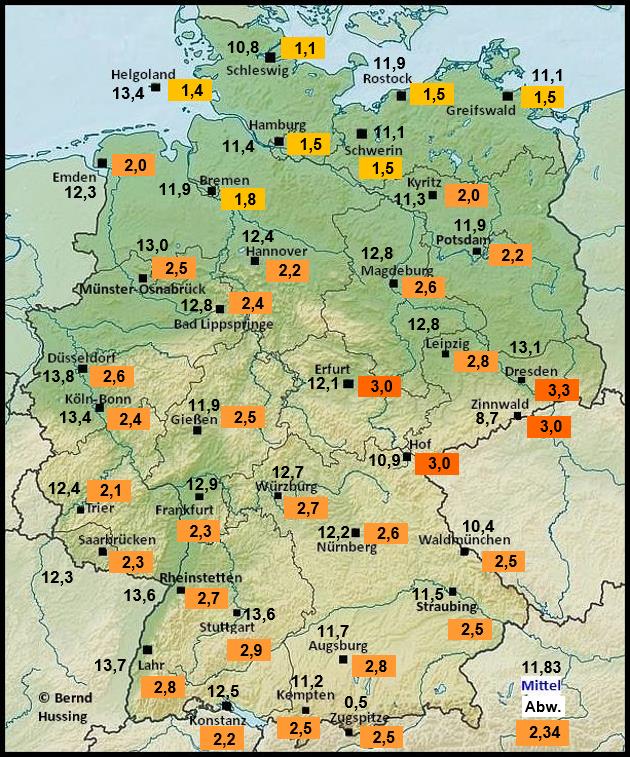 Temperaturmittel, dahinter die Abweichung zum langjährigen Mittel (1991-2020)