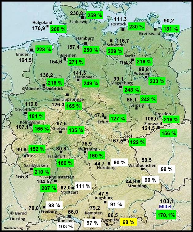 Niederschlagssumme, dahinter die Prozente im Vergleich zum langjährigen Mittel (1991-2020)