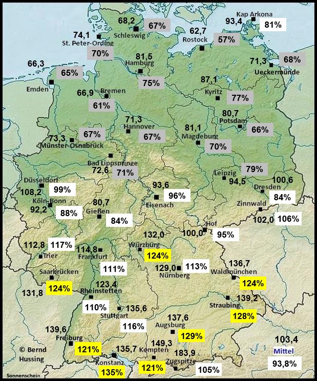 Sonnenscheinsumme, dahinter die Prozente im Vergleich zum langjährigen Mittel (1991-2020)