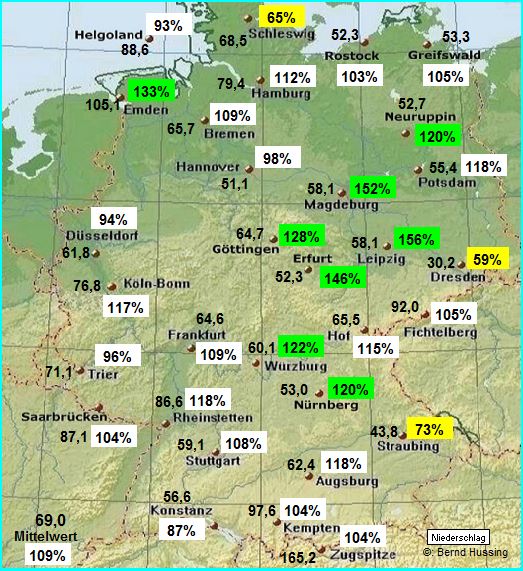 2. Niederschlagssumme, dahinter die Prozente im Vergleich zum langjährigen Mittel (1961-1990)