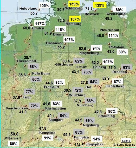 3. Sonnenscheinsumme, dahinter die Prozente im Vergleich zum langjährigen Mittel (1961-1990)