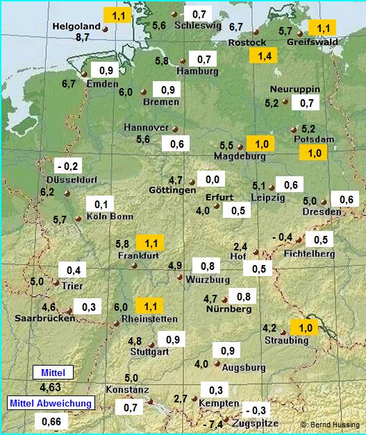 1. Temperaturmittel, dahinter die Abweichung zum langjährigen Mittel (1961-1990)