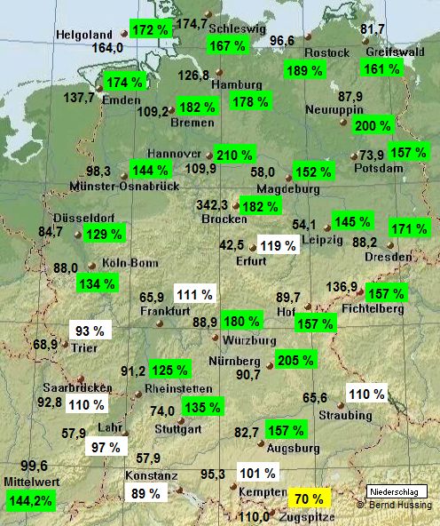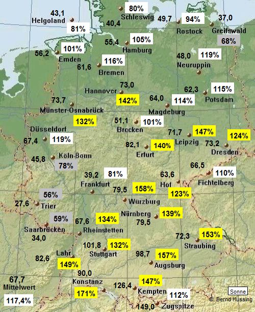 Niederschlagssumme, dahinter die Prozente im Vergleich zum langjährigen Mittel (1961-1990)