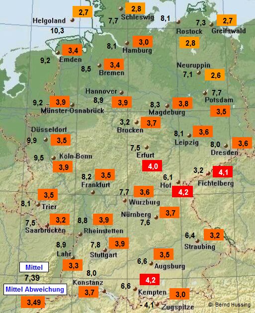 Temperaturmittel, dahinter die Abweichung zum langjährigen Mittel (1961-1990)
