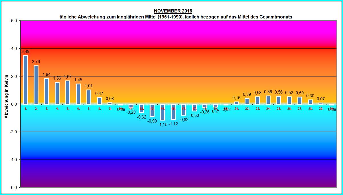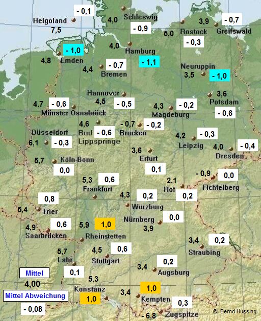 Temperaturmittel, dahinter die Abweichung zum langjährigen Mittel (1961-1990)