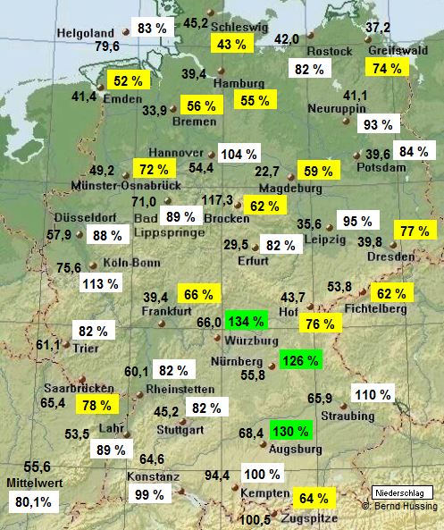 Niederschlagssumme, dahinter die Prozente im Vergleich zum langjährigen Mittel (1961-1990)