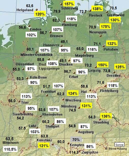 Sonnenscheinsumme, dahinter die Prozente im Vergleich zum langjährigen Mittel (1961-1990)