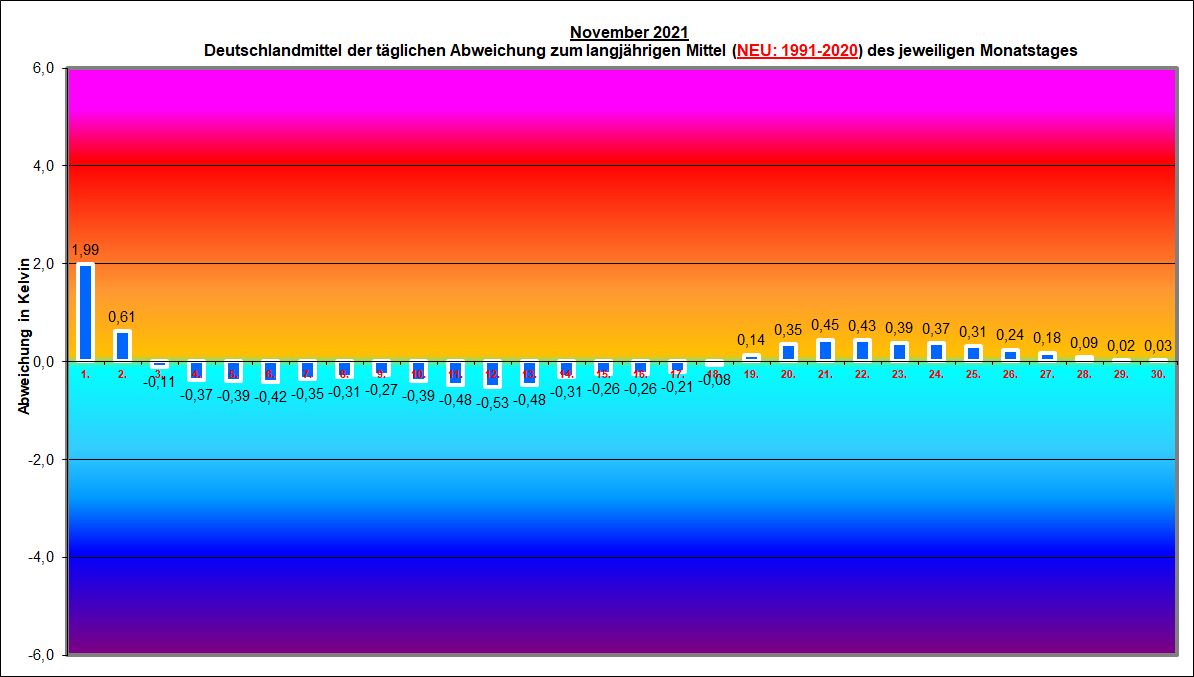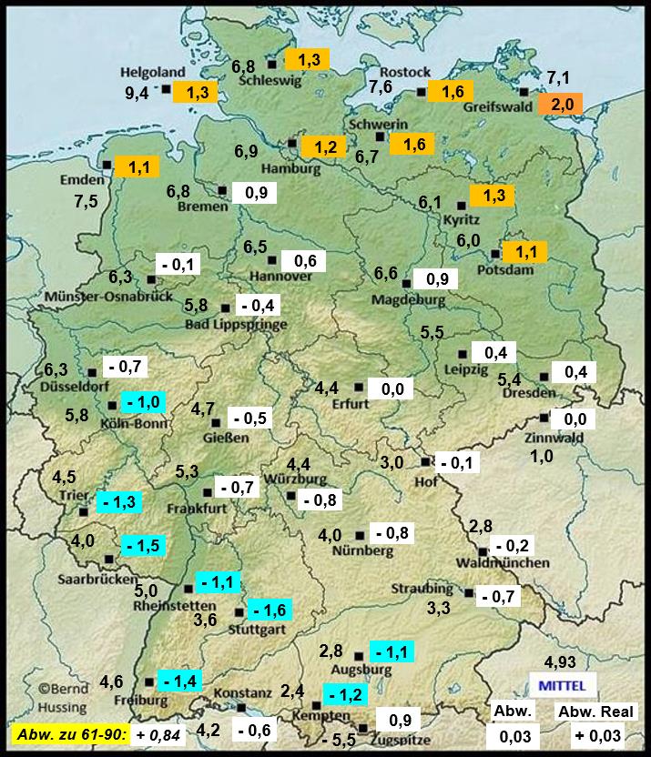 Temperaturmittel, dahinter die Abweichung zum langjährigen Mittel (NEU: 1991-2020)