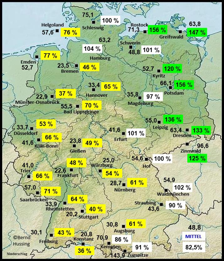 Niederschlagssumme, dahinter die Prozente im Vergleich zum langjährigen Mittel (NEU: 1991-2020)