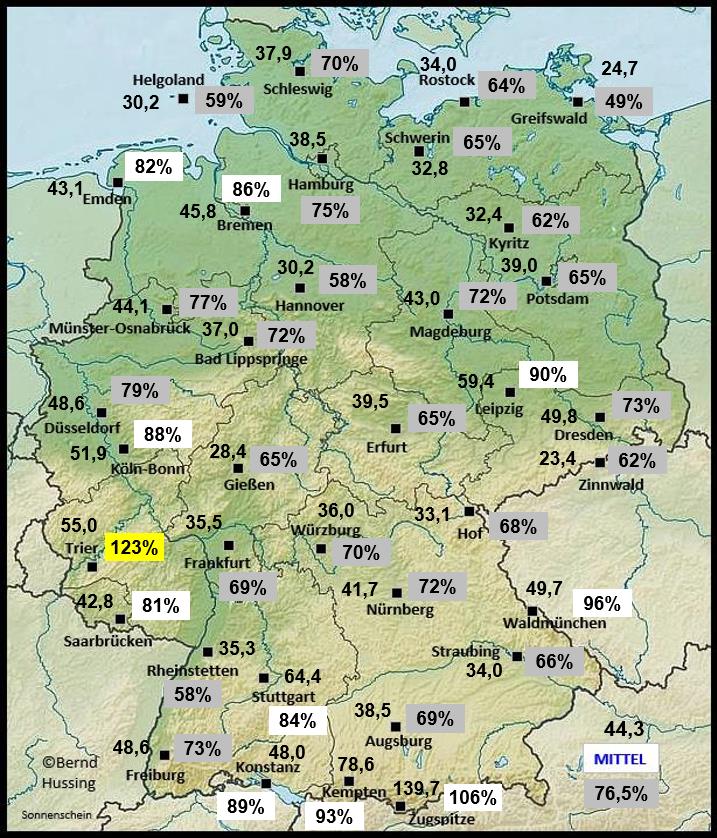 Sonnenscheinsumme, dahinter die Prozente im Vergleich zum langjährigen Mittel (NEU: 1991-2020)