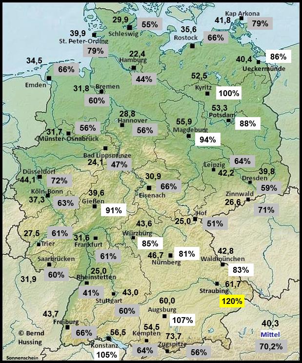 Sonnenscheinsumme, dahinter die Prozente im Vergleich zum langjährigen Mittel (1991-2020)