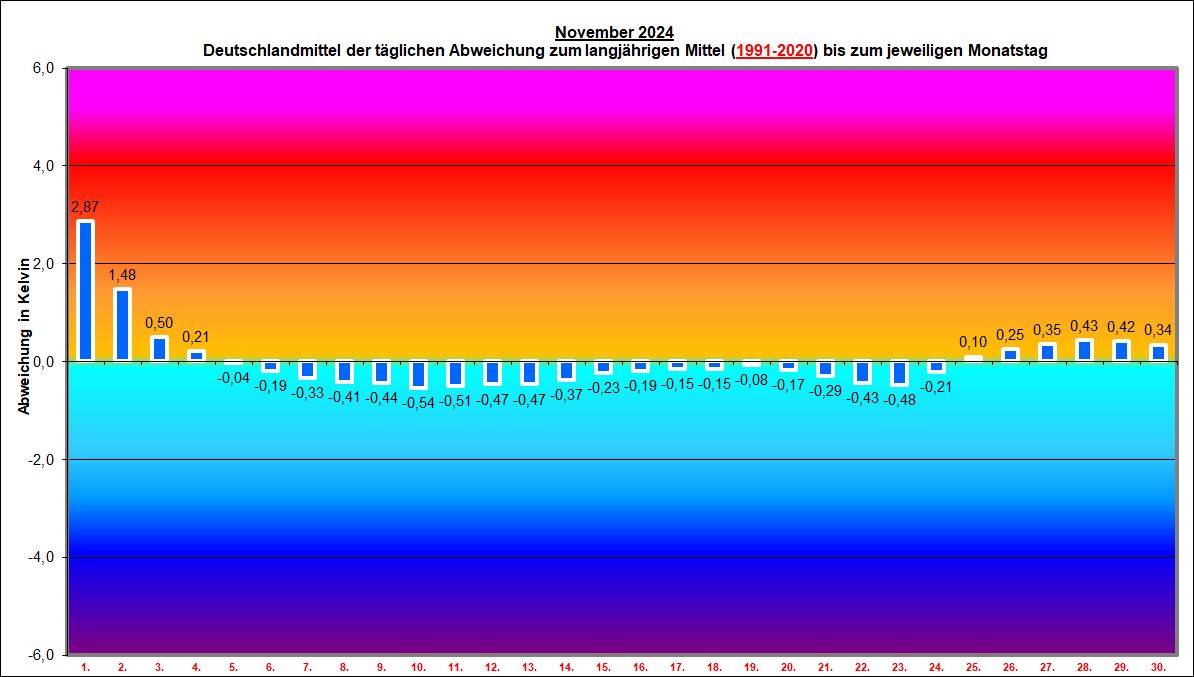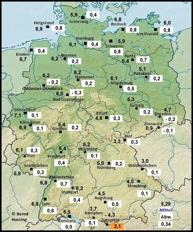 Temperaturmittel, dahinter die Abweichung zum langjährigen Mittel (1991-2020)