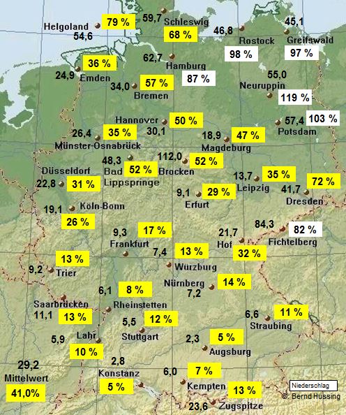 Niederschlagssumme, dahinter die Prozente im Vergleich zum langjährigen Mittel (1961-1990)