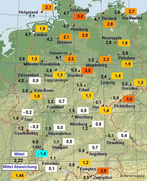 Temperaturmittel, dahinter die Abweichung zum langjährigen Mittel (1961-1990)